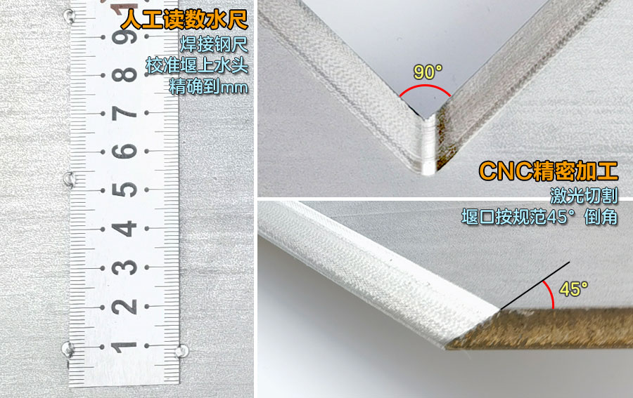 ● 304不銹鋼持久耐用不生銹 ● 堰口精加工倒角45° ● 標(biāo)配鋼尺可人工讀數(shù)或校準(zhǔn) ● 尺寸可按圖定制